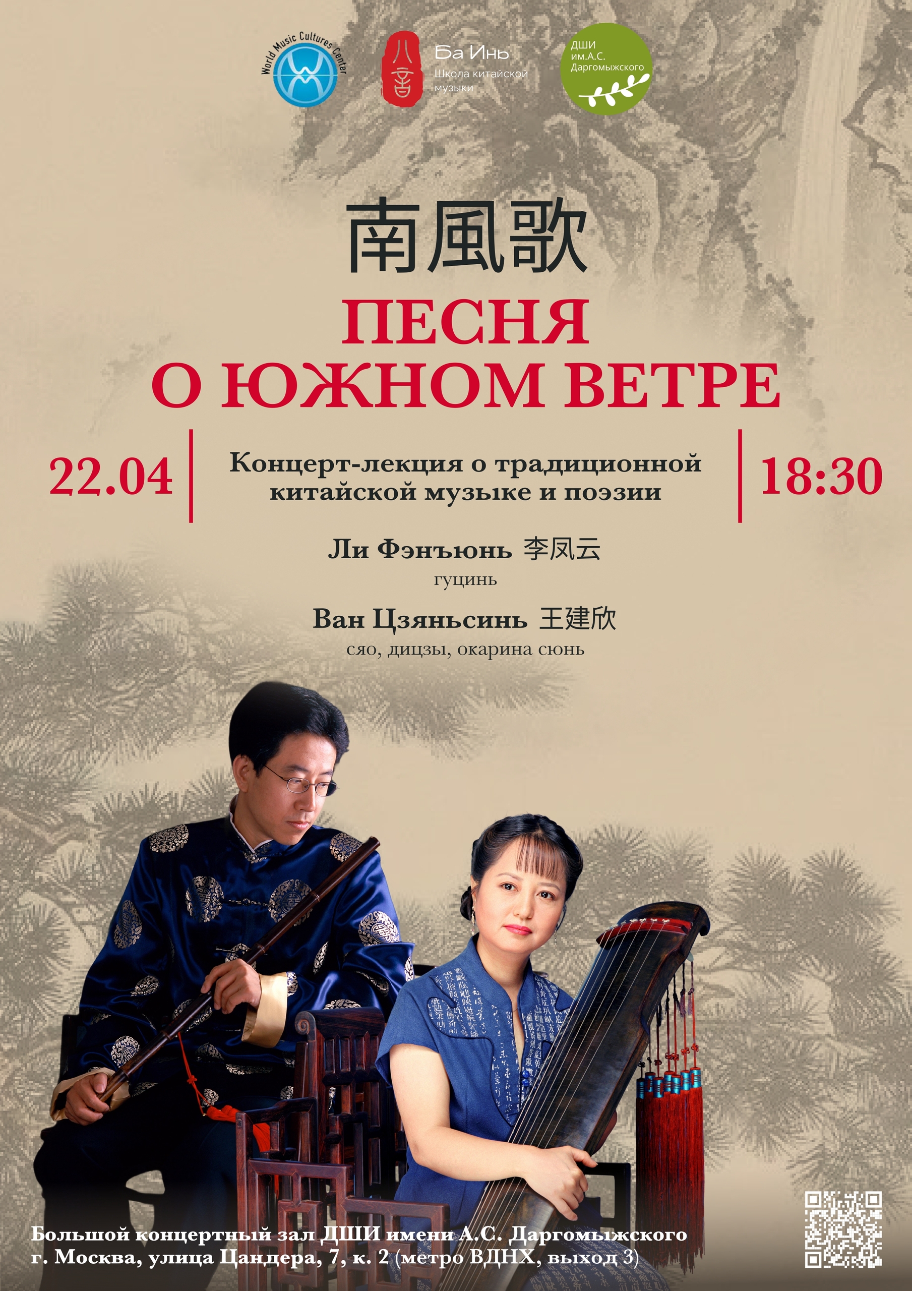 Профессоры Тяньцзиньской консерватории, выдающиеся исполнители на традиционных китайских инструментах, исследователи и преподаватели китайской музыки г-жа Ли Фэнъюнь и г-н Ван Цзяньсинь познакомят слушателей с классическим репертуаром цитры гуцинь, бамбуковых флейт сяо и дицзы. Доктор искусствоведения Ван Цзяньсинь расскажет об инструментах и их истории, о музыке и поэзии в культуре Китая.